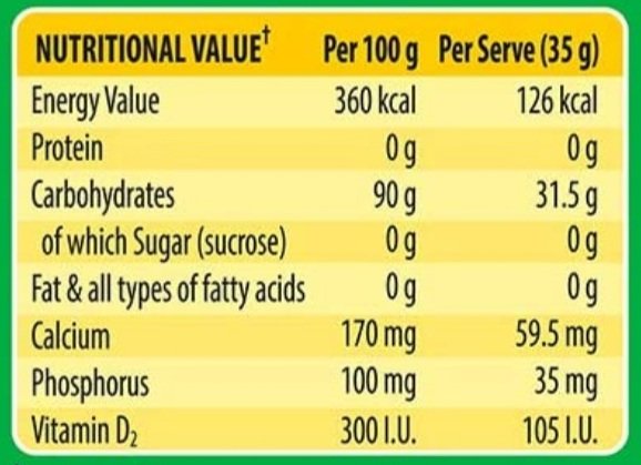 डेक्सट्रोज (ग्लूकोज़)- 99.4%, मिनरल्स (कैल्शियम फॉस्फेट) और विटामिन डी2।